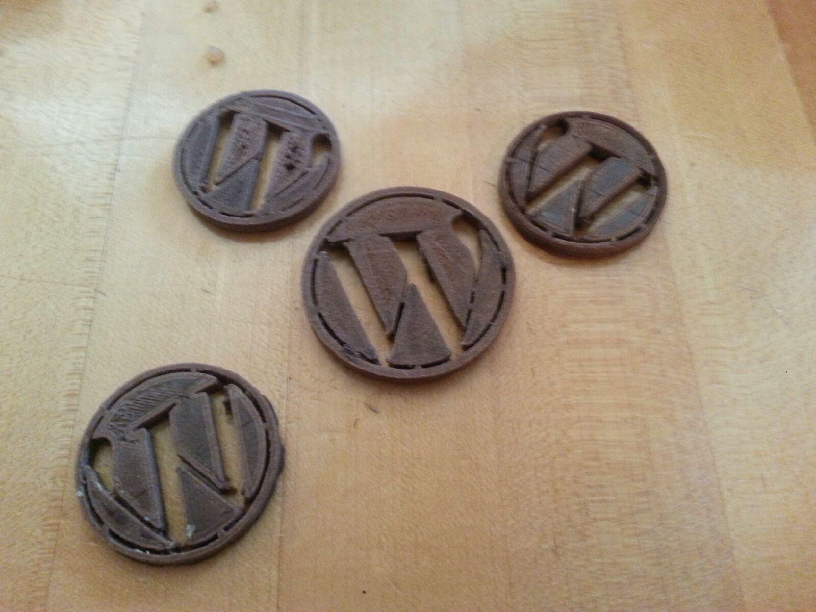 Posted: June 30, 2013 Filed under: 3D Printing, WordCamp 1 CommentIt’s day 3 of WordCamp Chicago 2013. On day 1, the Foundation Friday, my hobby of 3D Printing came up in conversation and someone suggested that I print a WordPress logo. On day 2 I brought two 3D Printed logos, printed with Cherry Laywoo-d3, a material used for 3D printing made from repurposed sawdust mixed with a plolymer (pro tip: saying polymer in an meaningful context make you sound smart!).