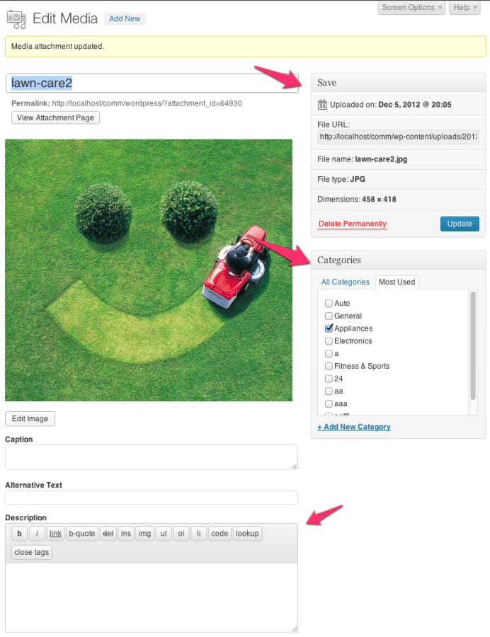 WordPress 3.5 Media Editor with Media Categories 1.5 turned on.